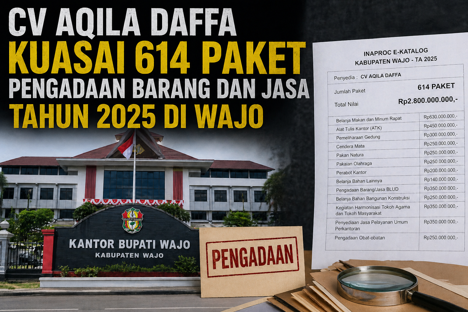 Updete, Wajo – Ratusan paket pengadaan barang dan jasa di Kabupaten Wajo pada Tahun Anggaran 2025 disebut didominasi oleh satu penyedia, yakni CV Aqila Daffa. Kondisi ini memicu sorotan publik terkait transparansi dan persaingan dalam proses pengadaan pemerintah daerah.